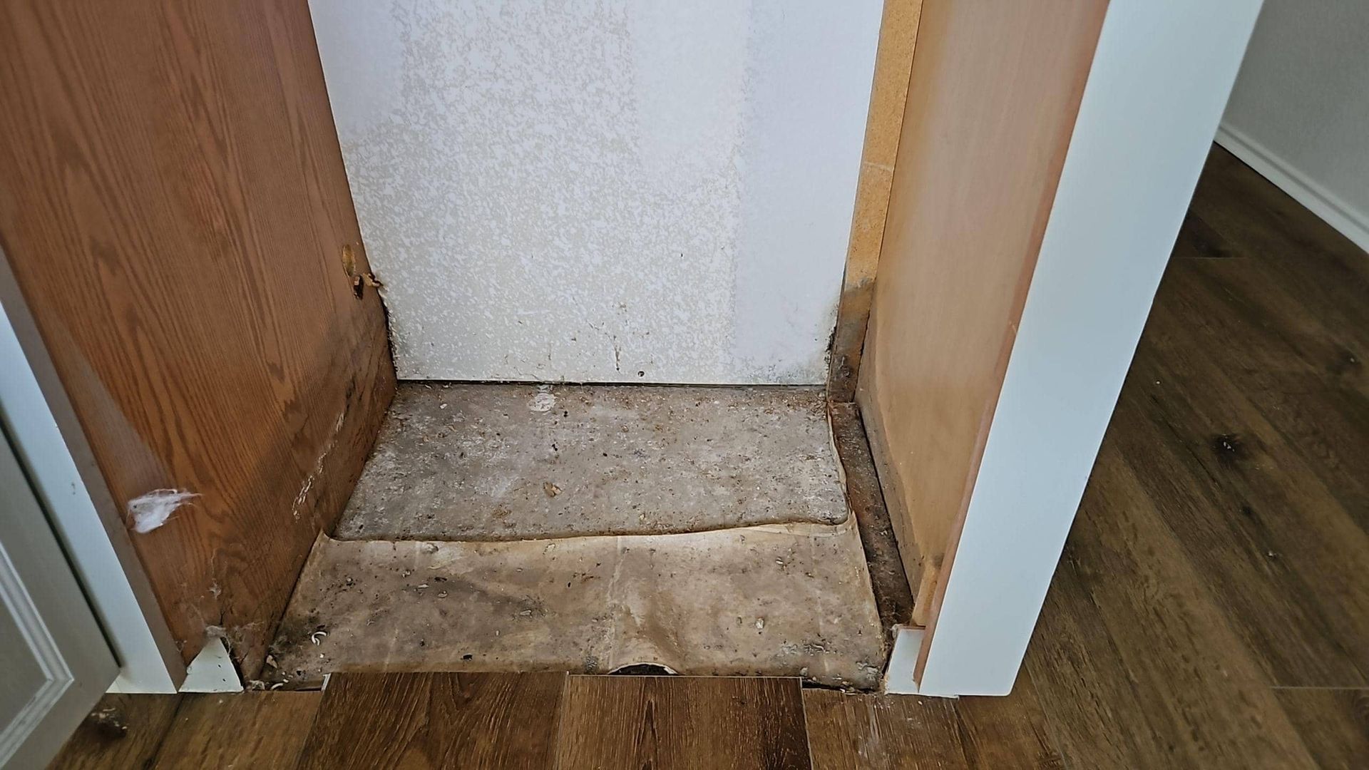 Once the containment area was all set up, the contractors could finally start to remove some of the materials that were too saturated to be dried out properly. They ended up removing some of the drywall and baseboards in the living room, and they also removed cabinets and drywall in the kitchen.